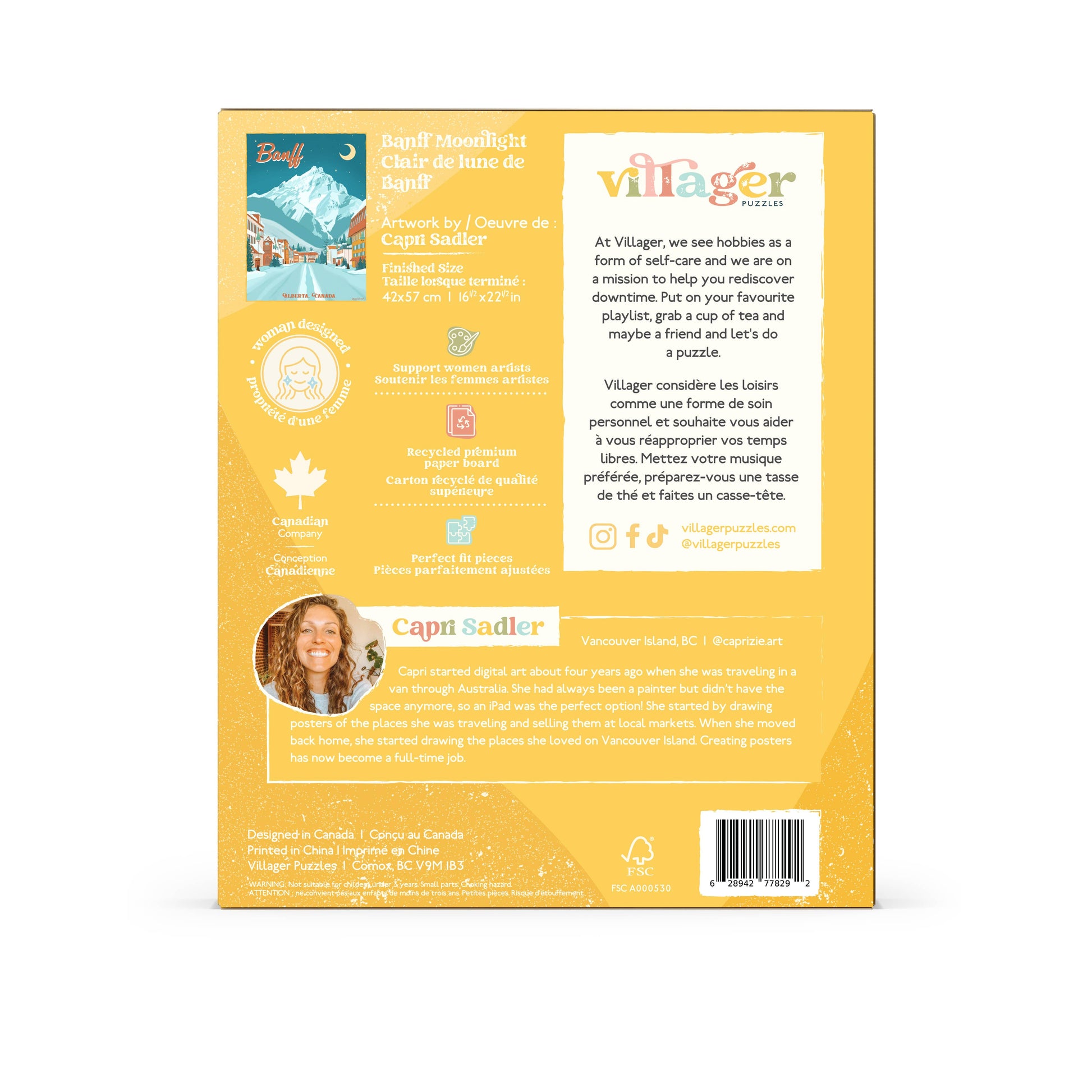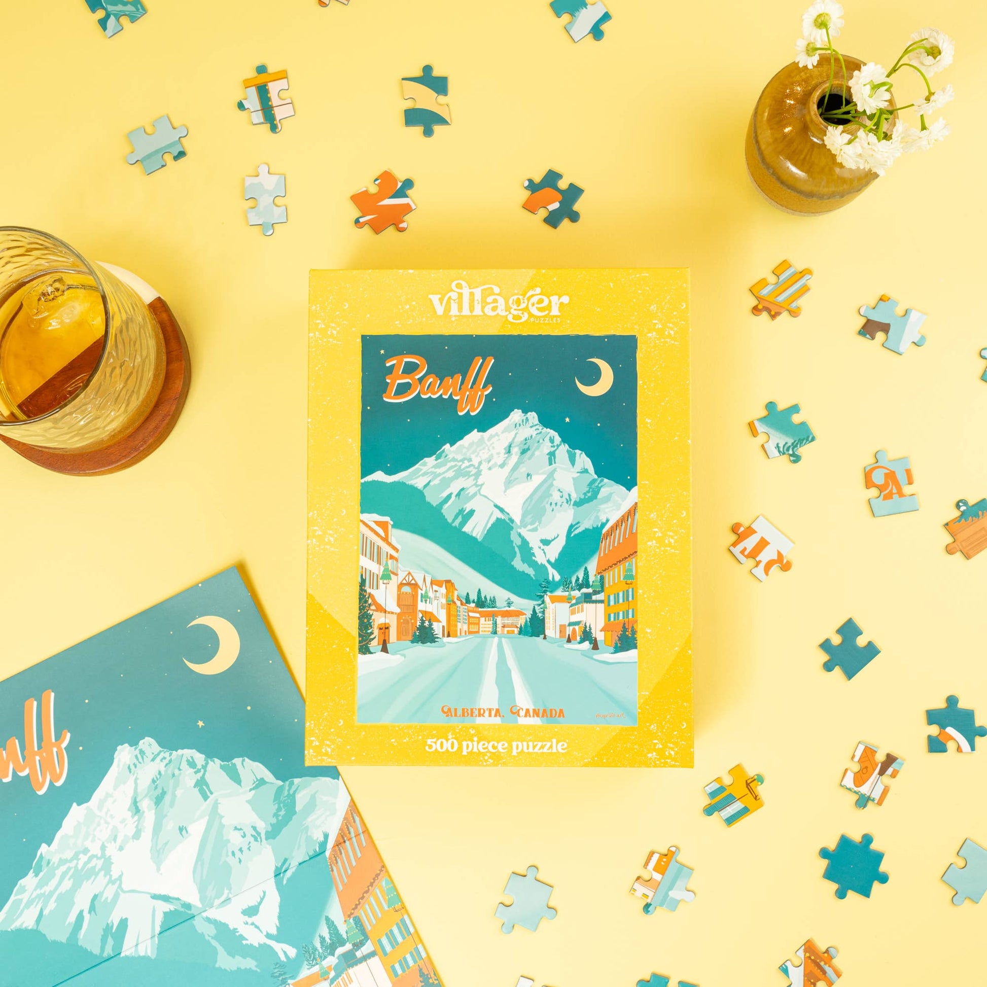 This beautifully-illustrated travel poster style puzzle of Banff, Alberta shows the town and mountains at night. Pairs with winter and outdoors themed decor, prints and gifts. Designed by Canadian artist and nature lover, Capri Sadler.