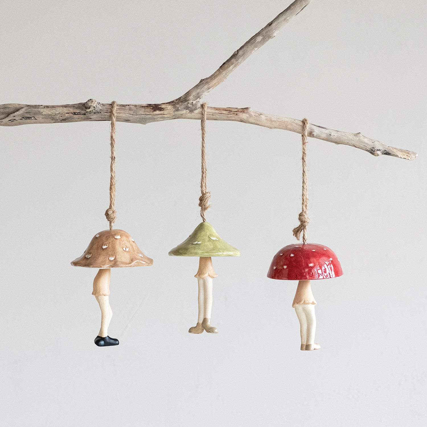 Charming hand-painted stoneware bells featuring whimsical mushroom designs with delightful person-shaped legs. Each piece is uniquely crafted with its own character and variations. Perfect for adding a playful touch to your garden, patio, or outdoor space. Available in three distinct styles. Hang these delightful decorative bells to create a cheerful garden accent that brings personality and warmth to your outdoor environment.