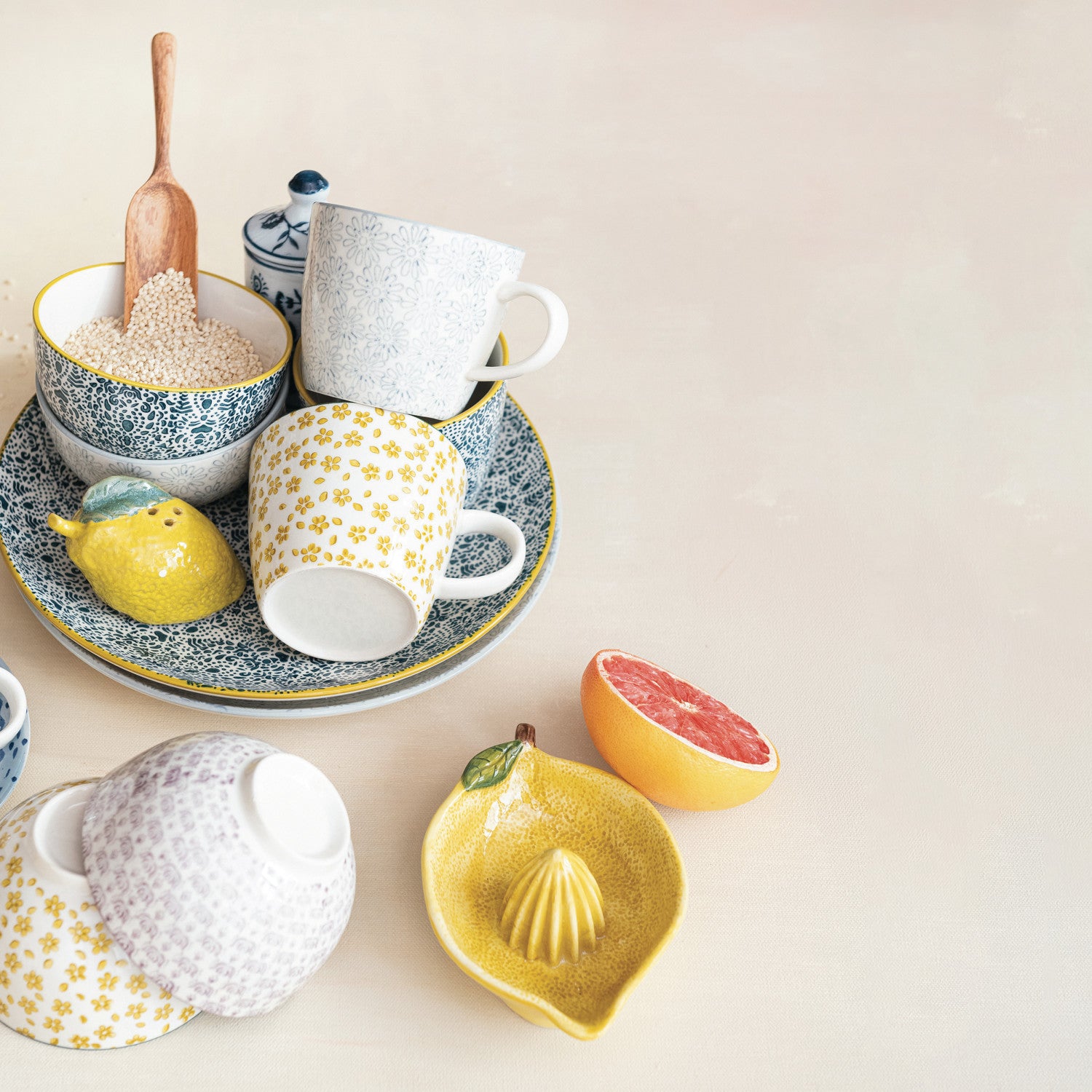 Artisan-crafted stoneware bowls featuring hand-stamped patterns in vibrant multi-colour designs. Each piece showcases unique detailing with four distinct style options to choose from. Perfect for serving, storage, or display, these durable bowls bring handmade character and warmth to any kitchen or dining space.
