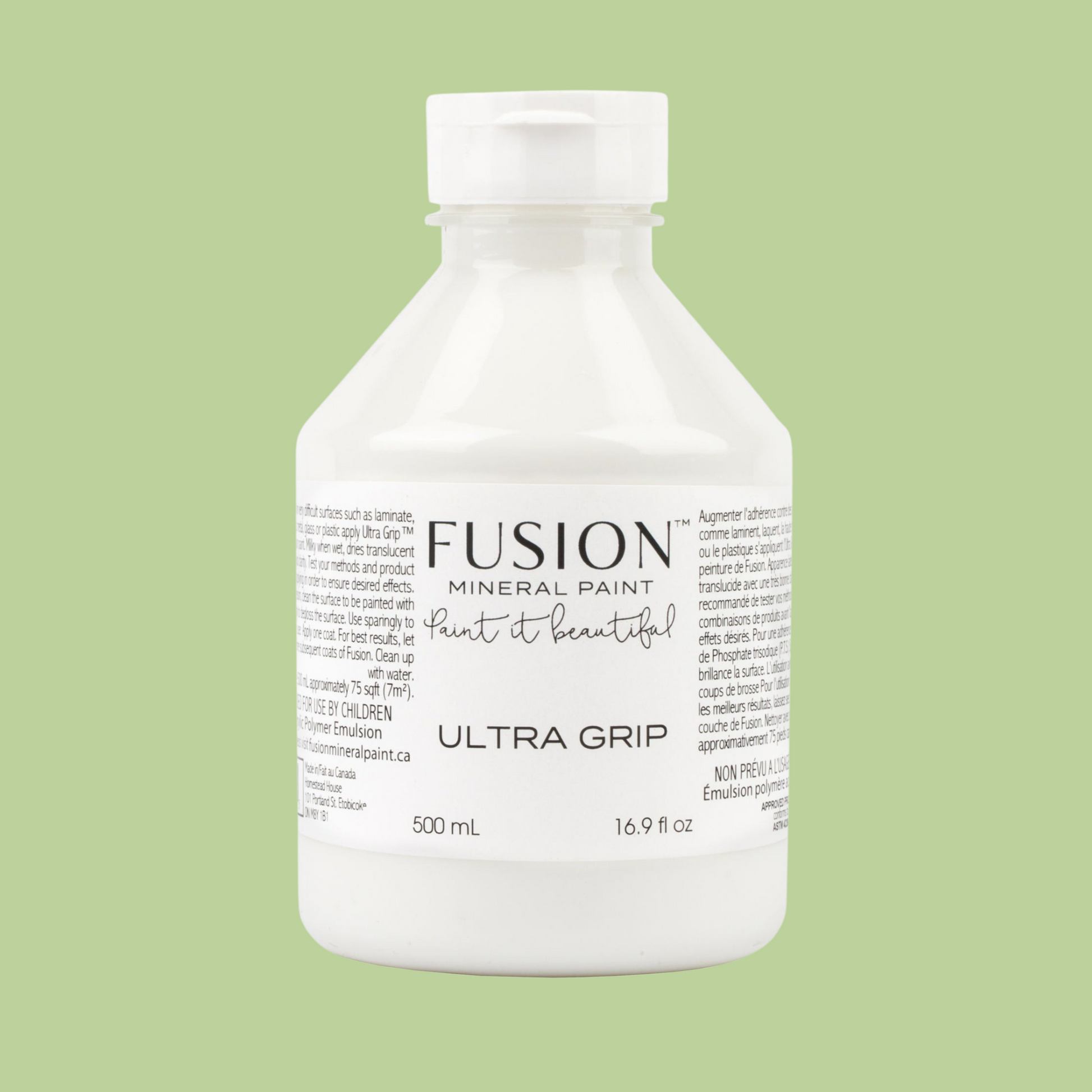 To use: Apply one very thin coat. Allow to dry for 12 hours before applying subsequent coats of Fusion™ colours. Clean up with water. Because Ultra Grip is so strong, it can hold more texture, so if you apply it heavily with a brush, you will see brush marks, so apply thin and sparingly with a sponge.